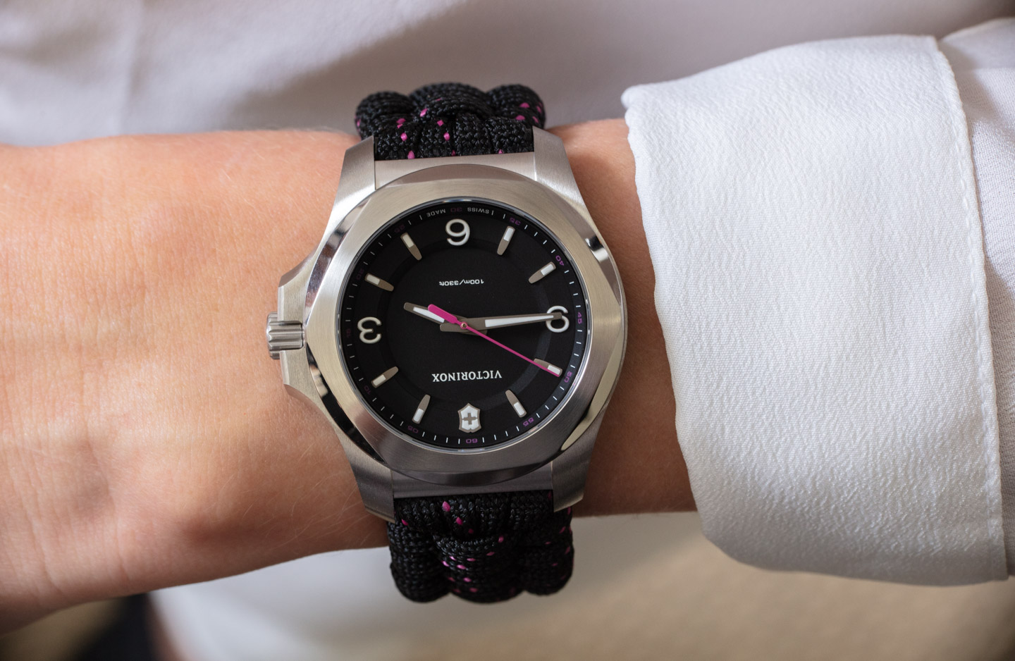 Victorinox Swiss Army 为新一代 INOX V 系列在表盘上保持相同的 100 米防水和蓝宝石水晶。该公司还开始为 INOX V 提供流行的女士伞绳表带,但也提供更传统的橡胶表带选项,具体取决于版本。如图所示,这是 Victorinox Swiss Army INOX V 型号 241918,采用天然抛光钢制成,带有黑色和粉红色调。