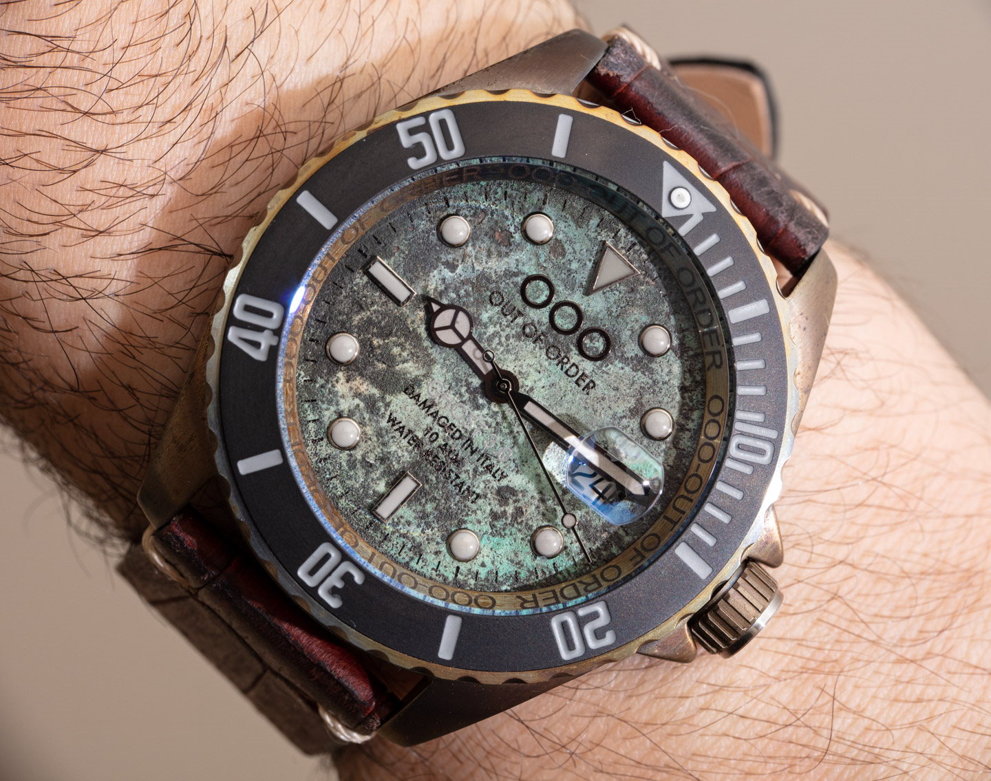表盘本身是传统的 Submariner 风格表盘,夜光色与表盘锈色相得益彰。很明显,这款手表的大部分设计都是为了让人联想到劳力士潜航者型,但话又说回来,它实际上看起来并不像劳力士会制造的任何东西。这使得此类模仿设计对我来说是可以接受的——也就是说,当它们不试图看起来像设计发起者会做的东西时,而是将现有的公式带入一个新的方向。这就是 Out Of Order 在这里所做的。