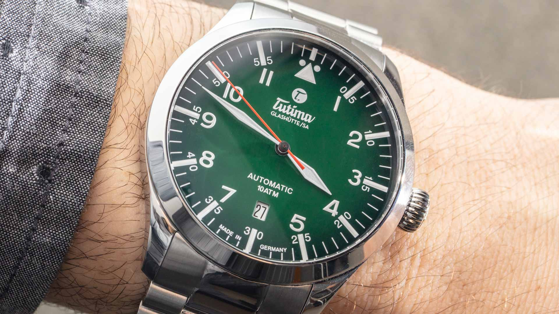在我看来,在图片中,绿色与红色和白色的组合看起来有点过于大胆。话虽如此,但事实上,渐变绿色表盘占据了主导地位,而Flieger 6105-30本人看起来非常英俊。作为一款工具手表,飞行员风格的指针和小时标记与面部形成了极好的对比,使其易读。日期窗口整齐对称地位于表盘上的6点钟位置。手的长度和手腕的舒适度等整体比例都很高。图蒂玛和其他德国运动手表制造商通常在人体工程学方面做得很好,而瑞士人似乎经常忘记这一点(当然,这取决于品牌)。然而,在这个价格水平上,我觉得德国工具式手表比大多数价格相似的瑞士手表更划算。
