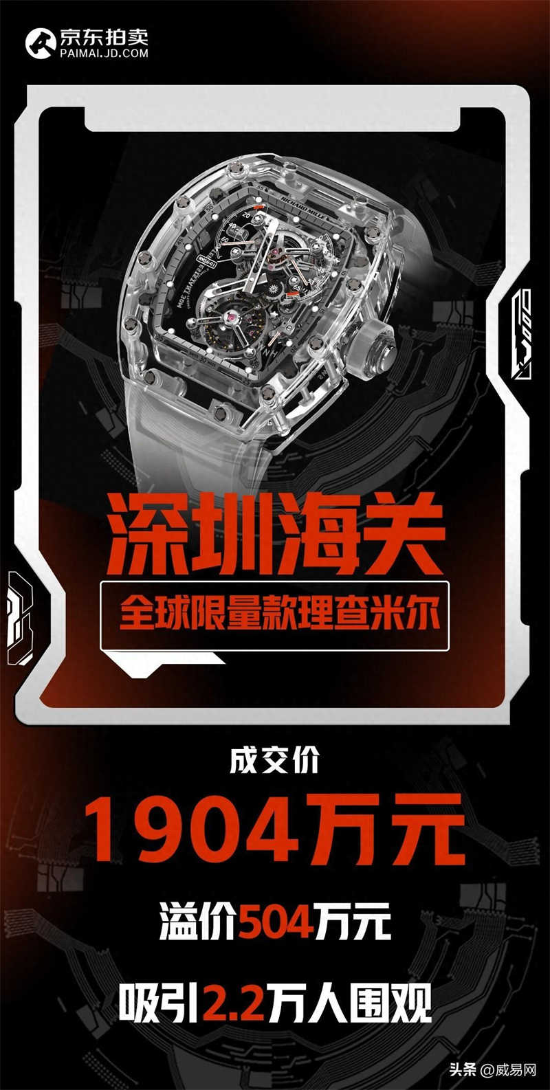 据采销直播间的工作人员介绍,这款腕表是理查米尔RM56-01,经由深圳海关委托京东资产交易平台进行公开拍卖,起拍价1400万元。对于资深收藏者来说,理查米尔绝对是腕表界的翘楚。自2001年于瑞士诞生以来,理查米尔凭借其卓越的加工工艺、不断创新的高科技材质以及出色的设计,成为收藏家和业内行家公认的当代制表的极致经典。
